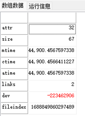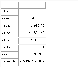 | 返回 | Array,TableArray | 数组,文件相关信息。具体下标含义如下:| 字段 | 含义 | | attr | 属性 | | size | 文件大小 | | mtime | 修改时间 | | ctime | 创建时间 | | atime | 访问时间 | | links | 引用数 | | dev | 设备序列号 | | fileindex | 文件索引 | Linux特有字段:| 字段 | | | rdev | 设备次序列号 | | uid | 用户标识符 | | gid | 组标识符 | | blksize | 块大小 | | blocks | 块数量 |