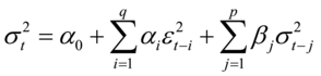 的滞后值。一个高阶的ARCH模型可以由一个更为简洁、更易识别估算的低阶GARCH 模型来表达。GARCH(p,q)模型的方差方程的一般形式如下: