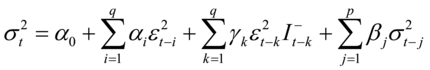 非对称的 ARCH 族模型:在金融时间序列的研究中经常会发现这种现象:不同信息的冲击常常表现为非对称的效应,即好消息和坏消息的冲击对波动性的影响程度不同。就许多股票而言,当前收益和未来波动之间有很强的负相关,收益增加时波动性减小,收益减小时波动性增加,这一趋势通常被称为杠杆效应。TARCH或GJR模型由Zakoian和Glosten,Jafanathan,Runkle(1994)提出,该模型中的方差方程如下: