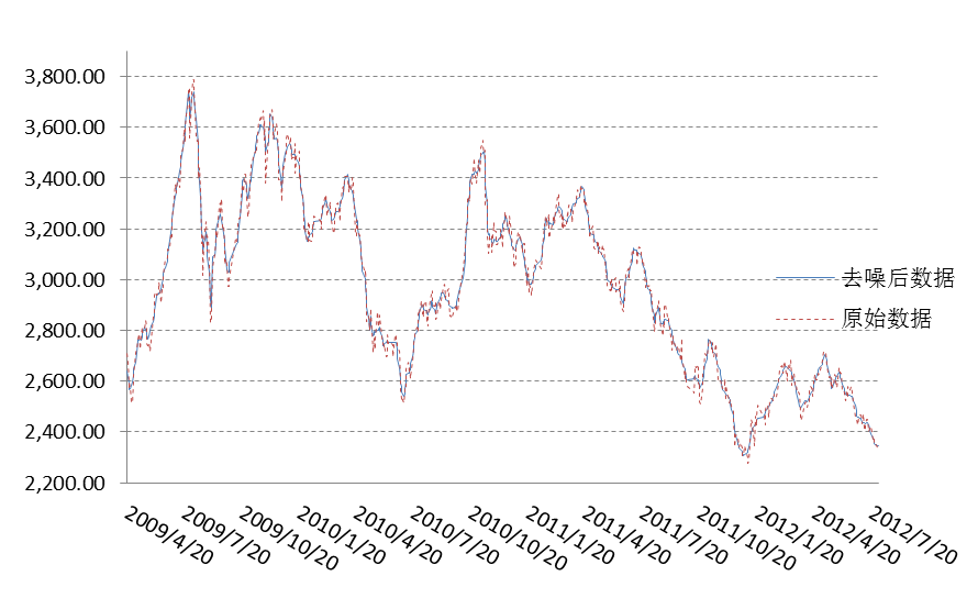 将去噪后的序列与原始收盘价序列进行比较后,可以发现大部分的小幅波动被去除, 而信号的主要特征均被保留, 得到1组消噪的时间序列