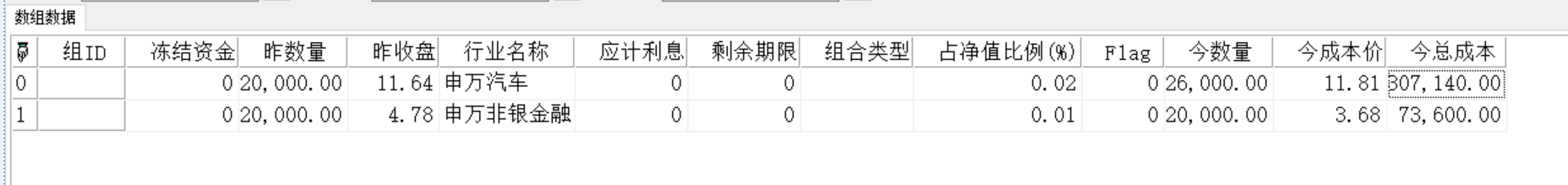 ("组ID":"","截止日":45147.0,"代码":"SH600369","名称":"西南证券","方向":1,"数量":20000.0,"收盘":4.7,"市值":94000.0,"总成本":74200.0,"成本价":3.71,"浮动盈亏":19800.0,"浮盈率(%)":26.6846361185984,"证券类别":2,"乘数":1,"保证金比例(%)":100,"保证金比例II(%)":0,"保证金占用":94000.0,"市值变动":-1600.0,"买入金额":0,"卖出金额":0,"买入金额2":0,"卖出金额2":0,"分红金额":0,"配股金额":0,"迁入金额":0,"迁出金额":0,"迁入金额2":0,"迁出金额2":0,"买入金额(税后)":0,"卖出金额(税后)":0,"买入金额2(税后)":0,"卖出金额2(税后)":0,"迁入金额(税后)":0,"迁出金额(税后)":0,"迁入金额2(税后)":0,"迁出金额2(税后)":0,"调入金额":0,"调出金额":0,"调入金额2":0,"调出金额2":0,"当日盈亏(净额)":-1600.0,"费用":0,"当日盈亏":-1600.0,"冻结资金":0,"昨数量":20000.0,"昨收盘":4.78,"行业名称":"申万非银金融","应计利息":0,"剩余期限":0,"组合类型":"","占净值比例(%)":0.00939997484378732,"Flag":0)