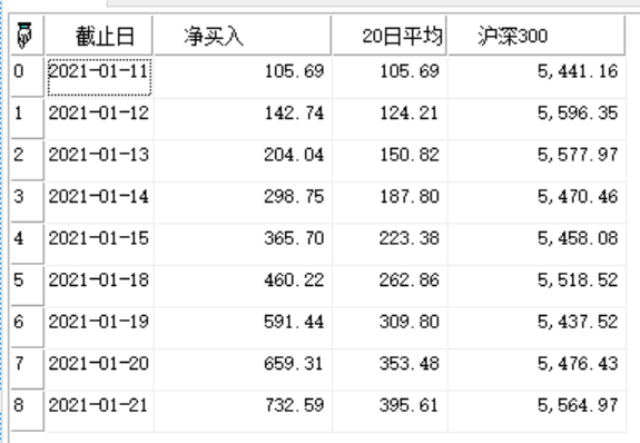 Return Block_HSGAccumCapitalFlow("HG000001","SH000300",20210110T,20210121T);