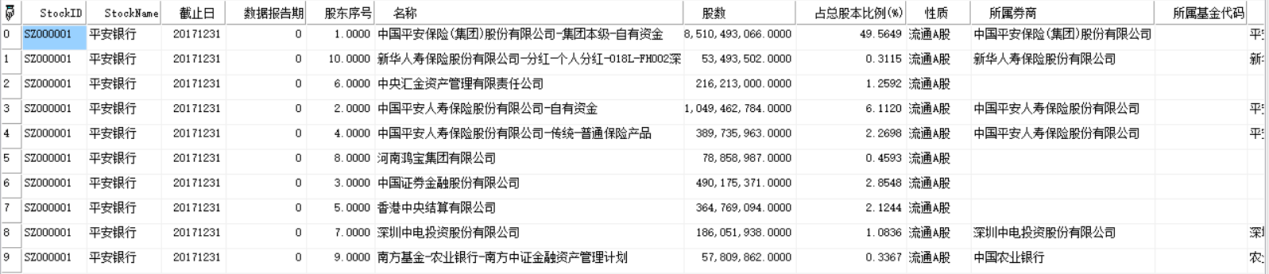 return bd_report2(20171231);//返回平安银行截止到2017年12月31日的十大流通股东