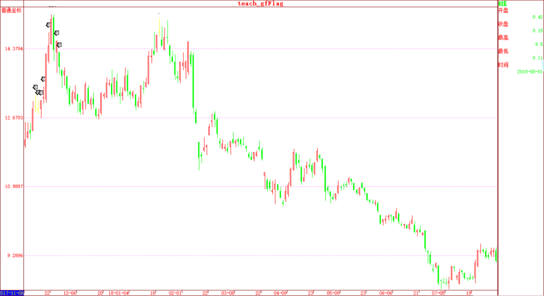 gfFlag函数教学函数。返回当前股票在截止日N(默认180)个周期的开盘价、收盘价、最高价、最低价、交易时间的图形,如果达到判定条件则做出标识,与系统参数(股票,周期,时间,复权,周期个数N)相关。