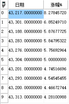 用户自由数据教学函数。获取UserDBname表,提取‘涨幅%’字段数据前十的数据。