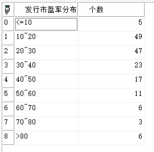 返回从开始日期到截止日期全市场中所有股票的市盈率分布。