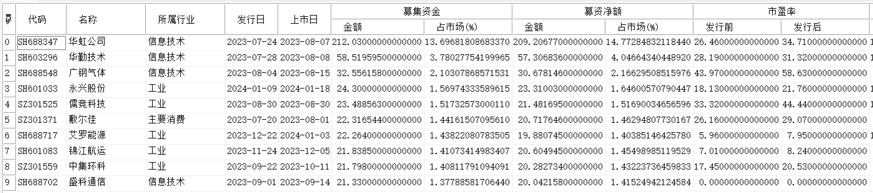| 返回 | Array | 二维数组,全市场中从开始日期到截止日期、募集资金排名前十的股票以及相应的募集资金数据。 |