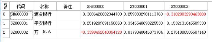 二维数组类型,高频股价涨幅-+相关性矩阵,其中行代码为-处理、列代码为+处理