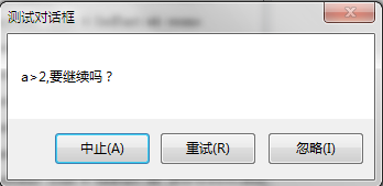 弹出如下消息对话框,选择“中止”则返回“中止”按钮id的返回字,选择“重试”则返回“重试”按钮id的返回字。选择“忽略”及返回“忽略”按钮Id的返回字。