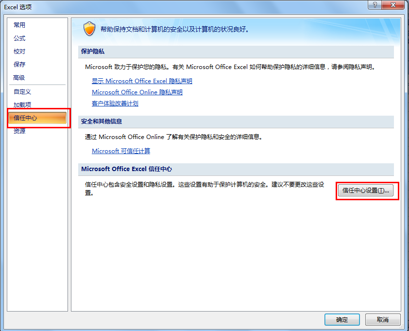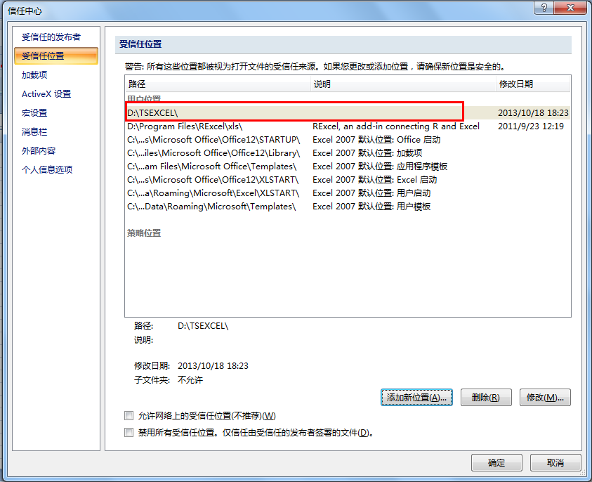 进入到Excel选项-》信任中心-》信任中心设置-》受信任位置-》添加新位置;