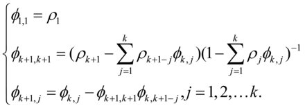偏自相关系数,计算随机序列与所有滞后阶数的偏自相关系数,返回结果是一个数组。偏相关系数的计算公式如下: