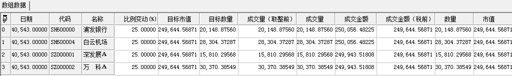 ("日期":40543.00,"代码":"SZ000002","名称":"万科A","方向":1.00,"调仓前比例(%)":0.00,"调仓后比例(%)":25.00,"调仓前数量":0.00,"成交价":8.22,"开仓费率(%)":0.11975,"平仓费率(%)":0.01975,"乘数":1.00,"保证金比例(%)":100.00));