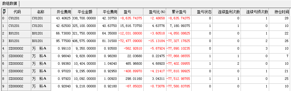 ("代码":"SZ000002","名称":"万科A","乘数":1.00,"方向":1.00,"开仓日期":40556.00,"开仓价":9.01,"开仓数量":1100.00,"开仓费率(%)":0.01,"平仓日期":40569.00,"平仓价":8.5,"平仓数量":1100.00,"平仓费率(%)":0.01),