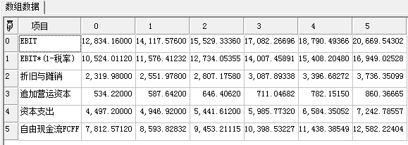 data:=array(("含义":"EBIT","数值":12834.16),("含义":"折旧与摊销","数值":2319.98),("含义":"追加营运资本","数值":534.22),("含义":"资本支出","数值":4497.2));