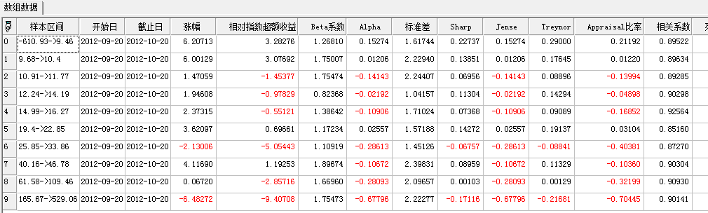 | 返回 | TableArray | 投资组合的按照某个值分割,比如按照市盈率分割成N等分,计算阶段的各个等分的表现情况(风险收益情况)。 |