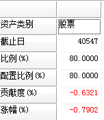 ("资产类别":"股票","截止日":40547,"比例(%)":80.00,"配置比例(%)":80.00,"贡献度(%)":-0.632126425285057,"涨幅(%)":-0.790158031606322));