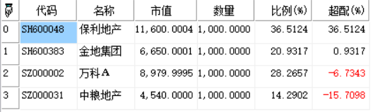 ("代码":"SZ000031","名称":"中粮地产","市值":4540.0,"数量":1000.0,"比例(%)":14.2902));