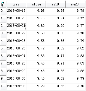 t:=nday(100,'time',sp_time(),'close',close(),'ma10',ma(close(),10),'ma20',ma(close(),20));