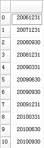 | 返回 | | 若无第二个参数,则返回一维数组,报告期列表。若存在第二个参数,则返回一个整数,报告期。 |