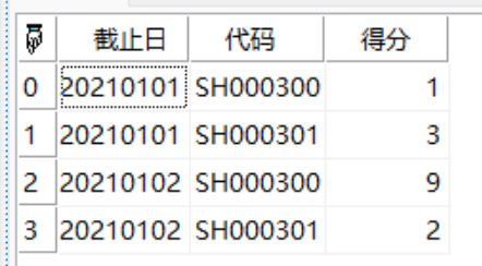 ('截止日':20210102,'SH000300':9,'SH000301':2),