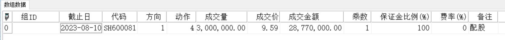 ("组ID":"","截止日":45147.0,"代码":"SH600081","名称":"东风科技","方向":1,"数量":10000000.0,"收盘":11.64,"市值":116400000.0,"总成本":124800000.0,"成本价":12.48,"浮动盈亏":-8400000.0,"浮盈率(%)":-6.73076923076923,"证券类别":2,"乘数":1,"保证金比例(%)":100,"保证金比例II(%)":0,"保证金占用":116400000.0,"占净值比例(%)":11.7400818497528)