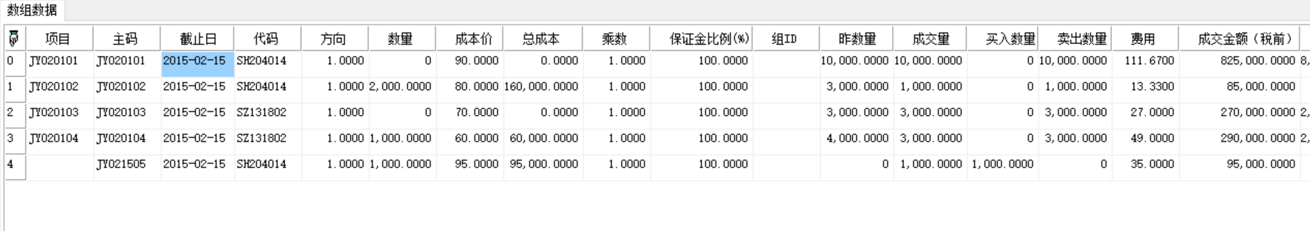 ("主码":"JY020102","截止日":42049.0,"代码":"SH204014","方向":1.0,"数量":3000.0,"成本价":80.0,"总成本":240000.0,"乘数":1.0,"保证金比例(%)":100.0,"组ID":""),