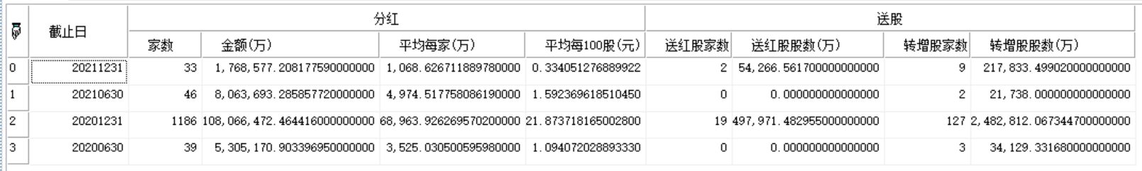 | 返回 | Array | 数组类型,返回指定板块指定年度区间报告期纵比分红送股数据 |