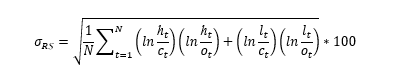 计算RS波动率因子,使用最高价、最低价、开盘价、收盘价计算出的波动率(%),与系统证券、时间、周期相关