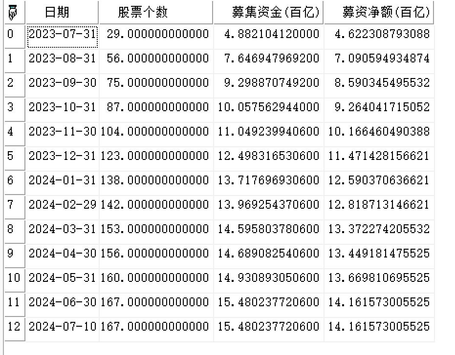 | 返回 | Array | 二维数组,全市场从开始日期到截止日期的汇总股票个数、募集资金、募资净额。 |