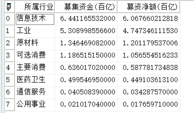 | 返回 | Array | 二维数组,按行业对全市场股票进行分组后从开始日期到截止日期、募集资金排名前十的行业以及相应的募集资金数据。 |