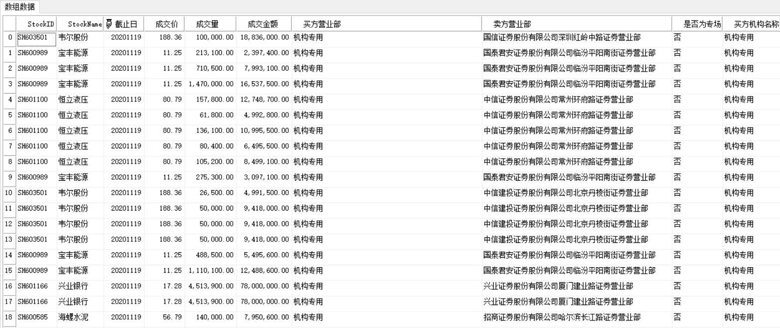 //2020年11月19日至2020年11月20日机构专用对于上证A股的大宗交易明细
