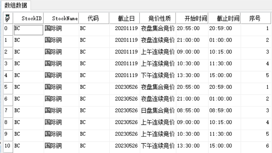 数组。证券历史交易时间。