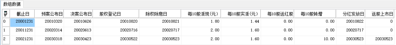 | 返回 | Array | 数组。指定股票区间分红送股情况。 |