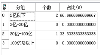 | GroupArr | Array | 一维数字数组, 一维数字数组,自定义规模分组,单位(亿),示例:array(2,20,100) 如果为正整数,表示频数分组数,从小到大分组,最小的为第1组 |