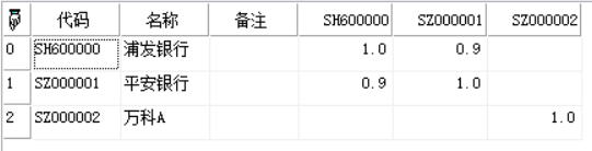 Data:= array(("代码":"SH600000","名称":"浦发银行","备注":nil,"SH600000":1.00,"SZ000001":0.90,"SZ000002":0),