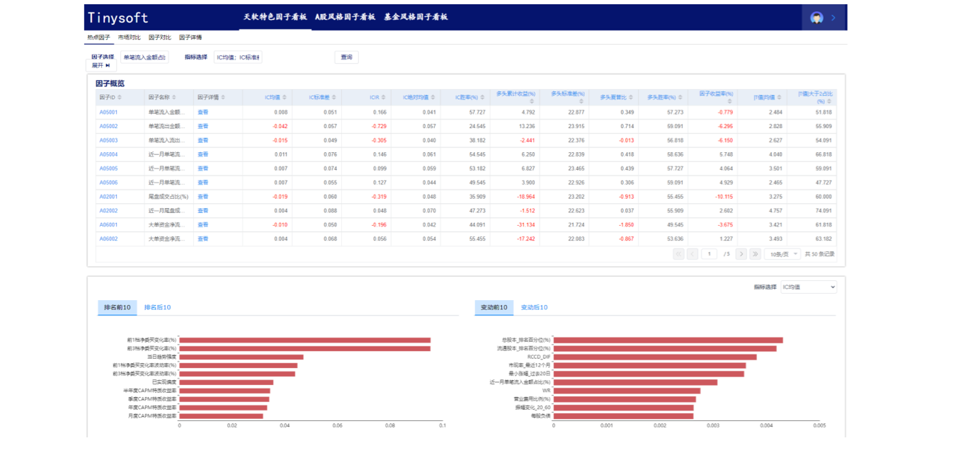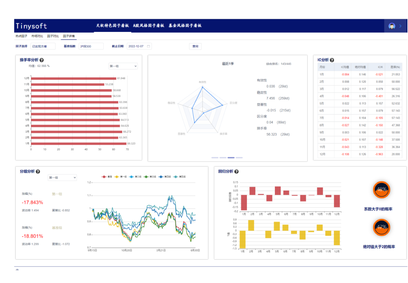因子看板持续跟踪天软特色因子库中单因子的回测表现,多角度展示因子各方面表现,判断因子的有效与失效。
