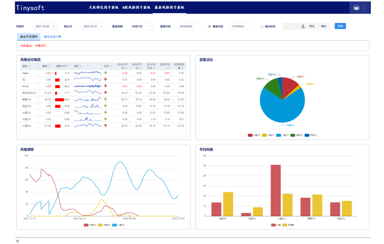 基金风格漂移是基于基金风格仓位因子所建立的分析基金风格在时序上变动的界面,可用于分析基金仓位变动,风格偏好等。